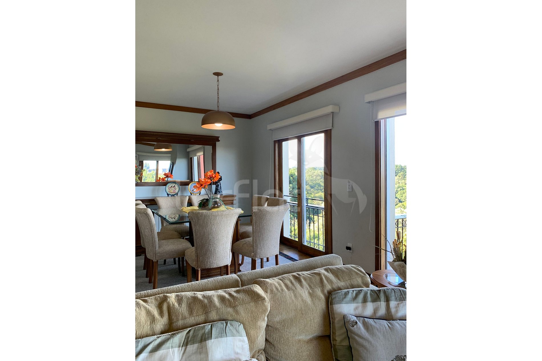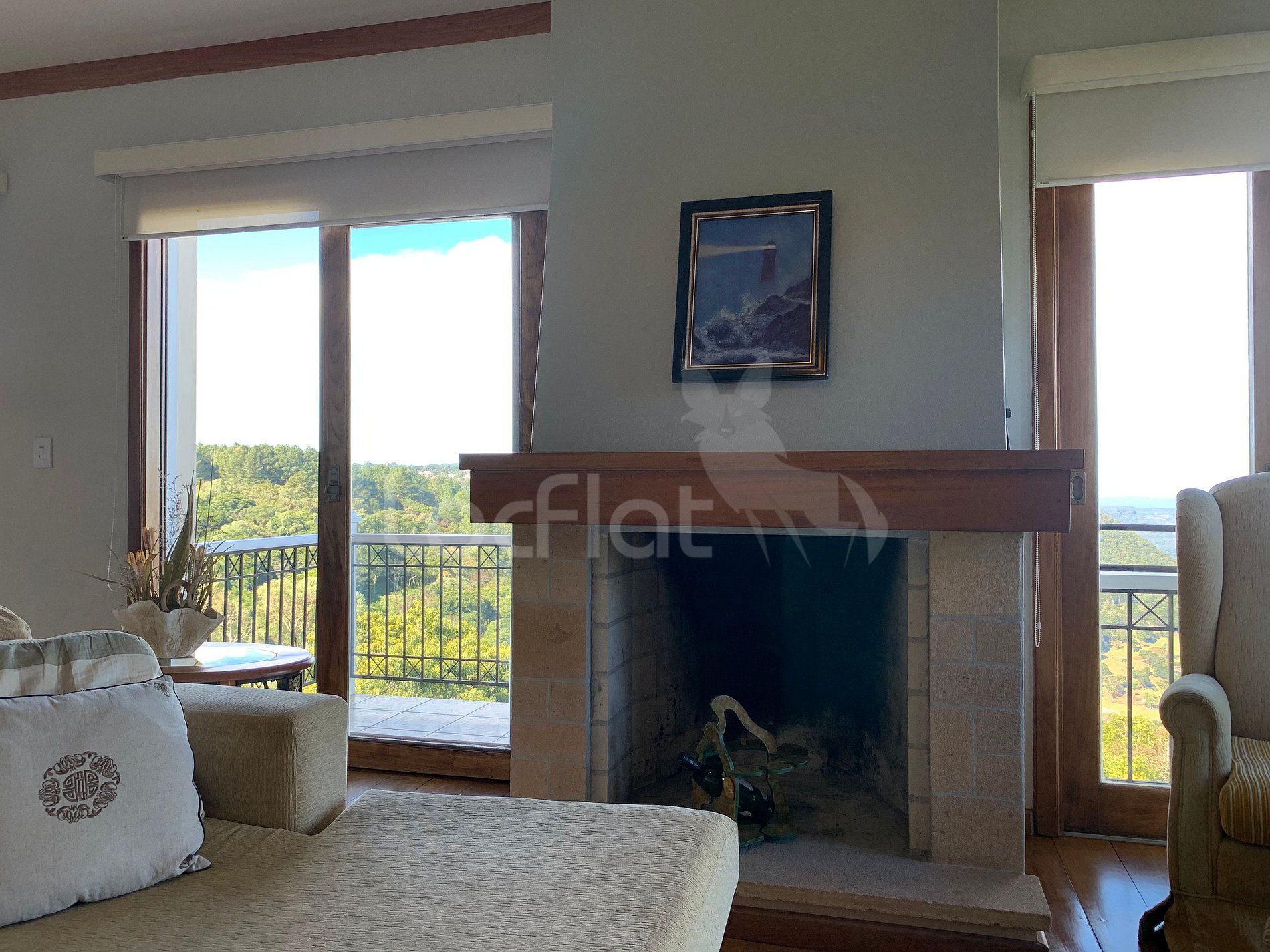 Sala de jantar para 8 pessoas. Ampla e confortável sala de estar com lareira e vista panorâmica para o Vale do Quilombo.