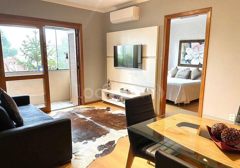 Apto completo - até 5 pessoas - 1 dorm - Centro Gramado - Ar Condicionado - Calefação - Internet Wi-Fi - Garagem - Smart TV com Netflix - Piscina aquecida - Sauna - Playground